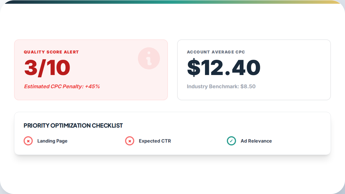This creates what you might call the efficiency trap. The more obvious the signal - someone searching for "best CRM software" - the more competition for that click, and the higher the price. Businesses that rely entirely on high-intent keyword targeting end up in an arms race that favors whoever has the largest budget. Beyond targeting, the technical setup behind your ads - conversion tracking, Quality Score, landing page experience - has a direct effect on what you pay.